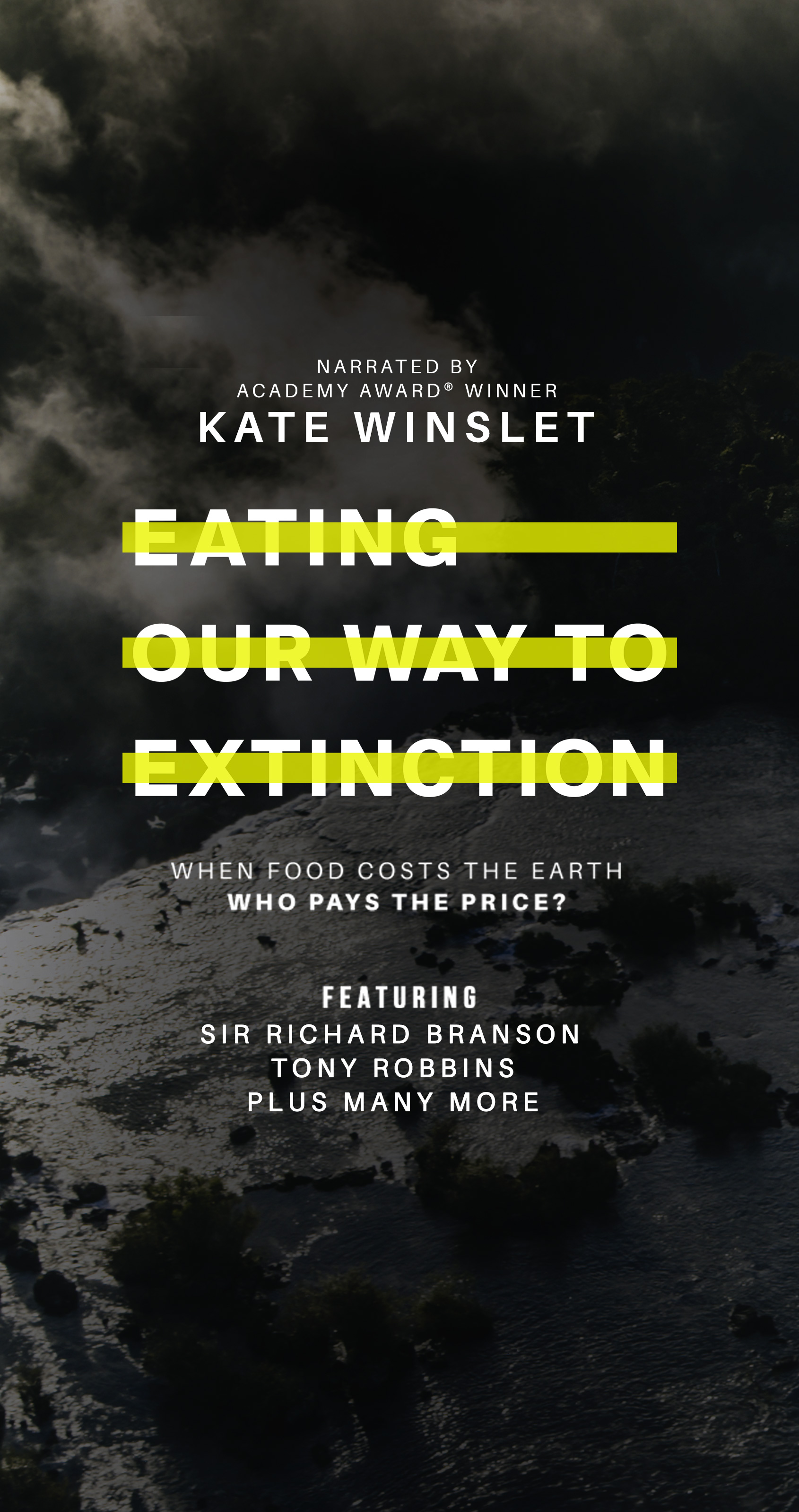 EATING OUR WAY TO EXTINCTION takes audiences on a cinematic journey around the world, from the depths of the Amazon rainforests to the Taiwanese Mountains, the Mongolian desert, the US Dust Bowl, the Norwegian Fjords and the Scottish coastlines, telling the story of our planet through shocking testimonials, poignant accounts from indigenous people most affected by our ever-changing planet, globally renowned figures and leading scientists. This powerful documentary sends a simple but impactful message by uncovering hard truths and addressing, on the big screen, the most pressing issue of our generation – ecological collapse.
